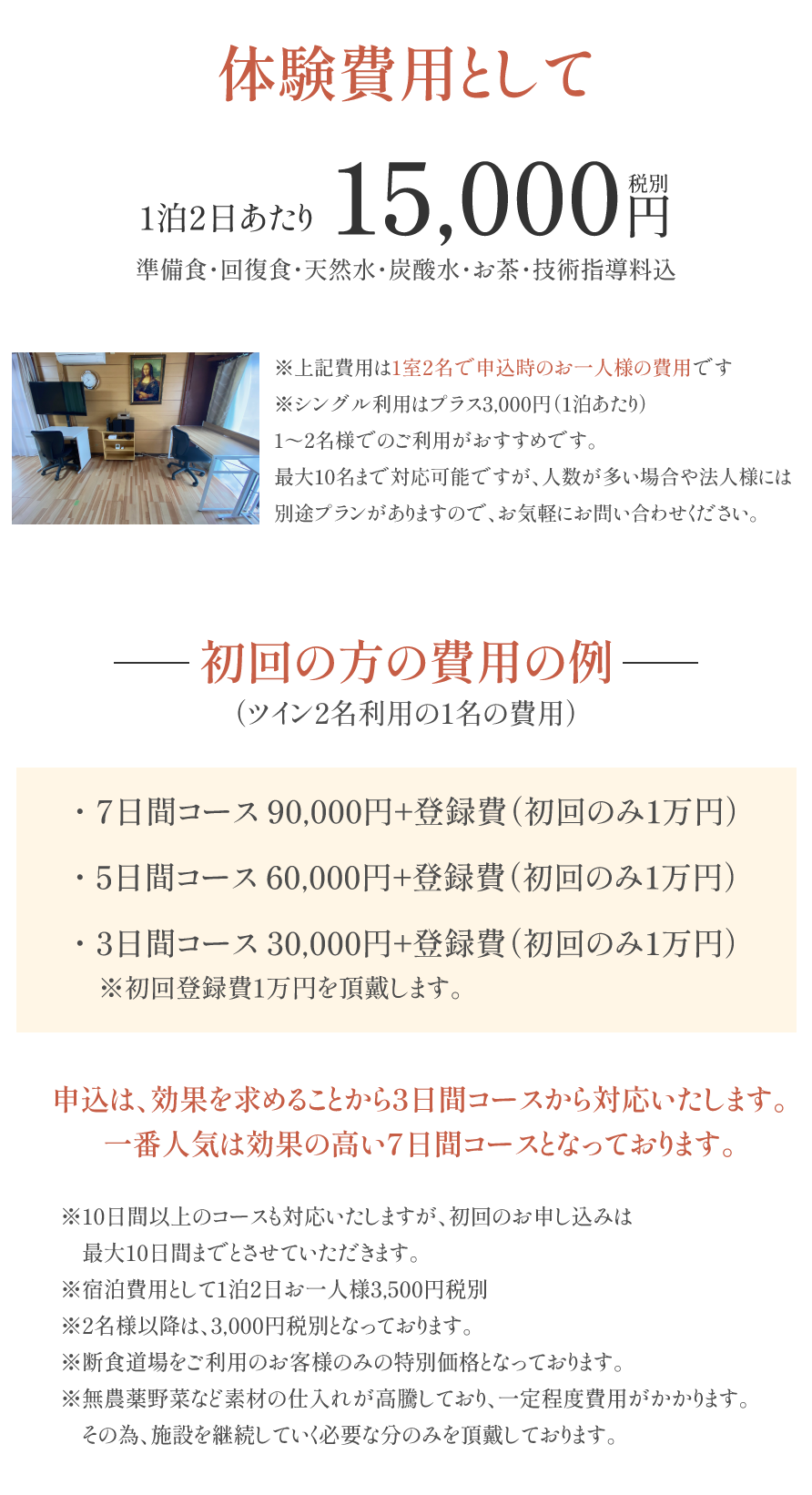 断食道場へのお申込みの場合には、訪れた方が体質改善、所願達成ができるよう、最低限の必要経費として、特別プラン1泊あたり 3,500円税別とさせていただきます。